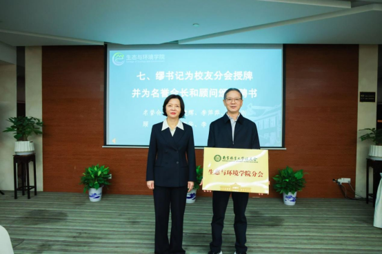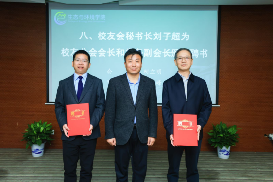 缪子梅向生态与环境学院校友分会授牌,并为名誉会长、顾问颁发聘书。刘子超为学院校友分会会长柯立明、常务副会长毛岭峰颁发聘书。