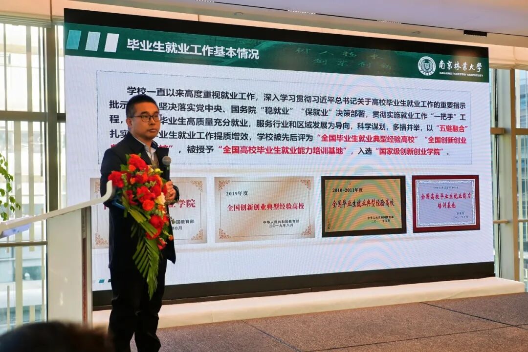 南京林业大学学生工作部副部长、就业创业指导中心主任陈养彬教授做了《南京林业大学就业工作情况简介》。据介绍,南京林业大学毕业生去向落实率始终保持在92%以上,2025届本科深造率为43.4%。希望校友们有用人需求的时候能来南林招聘。