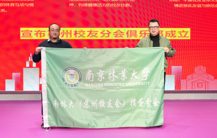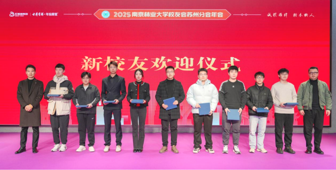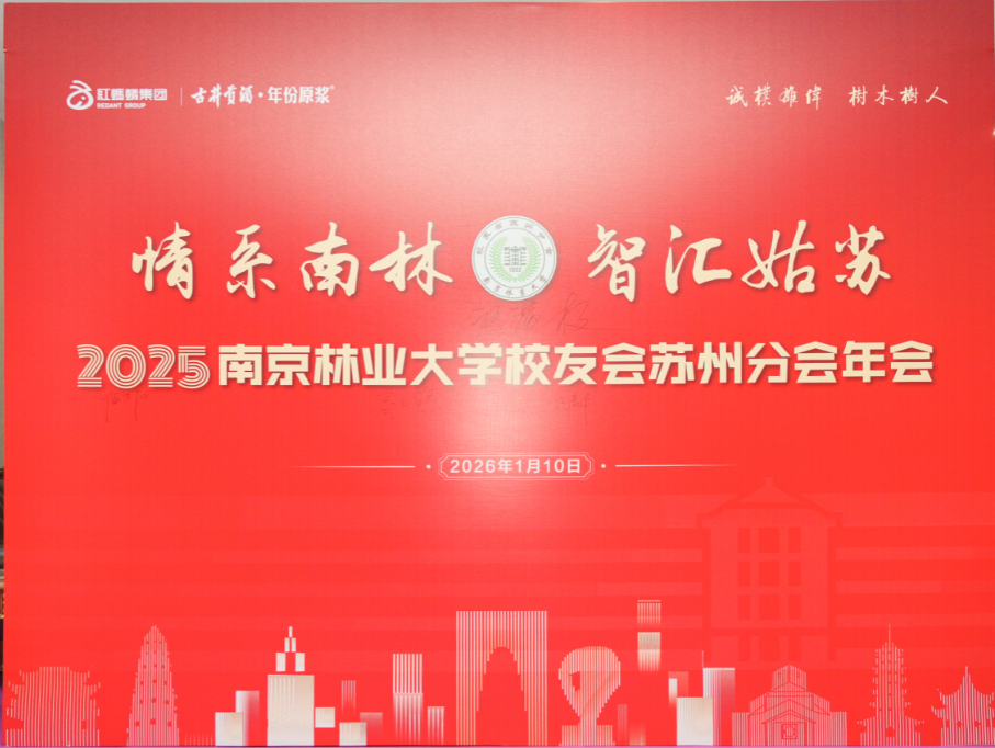 1 月 10 日,以"情系南林・智汇姑苏"为主题的南京林业大学苏州校友分会 2025 年年会在红蚂蚁装饰集团隆重举行。来自苏州及周边地区的南林校友齐聚一堂,共忆校园岁月,共话发展机遇,谱写校友情谊与协同发展的新篇章。南京林业大学校友工作办公室主任刘子超、材料科学与工程学院党委书记孟国忠,大学生就业创业指导中心主任陈养彬、科技处副处长蒋国斌、化学工程学院教授林中祥、材料科学与工程学院原党委书记石德兴等母校领导和老师,以及来自上海校友分会、浙江校友分会、安徽校友分会、北京校友分会、无锡校友分会和云南校友分会的代表及嘉宾约100人共同出席活动,年会由黄蕊校友主持。