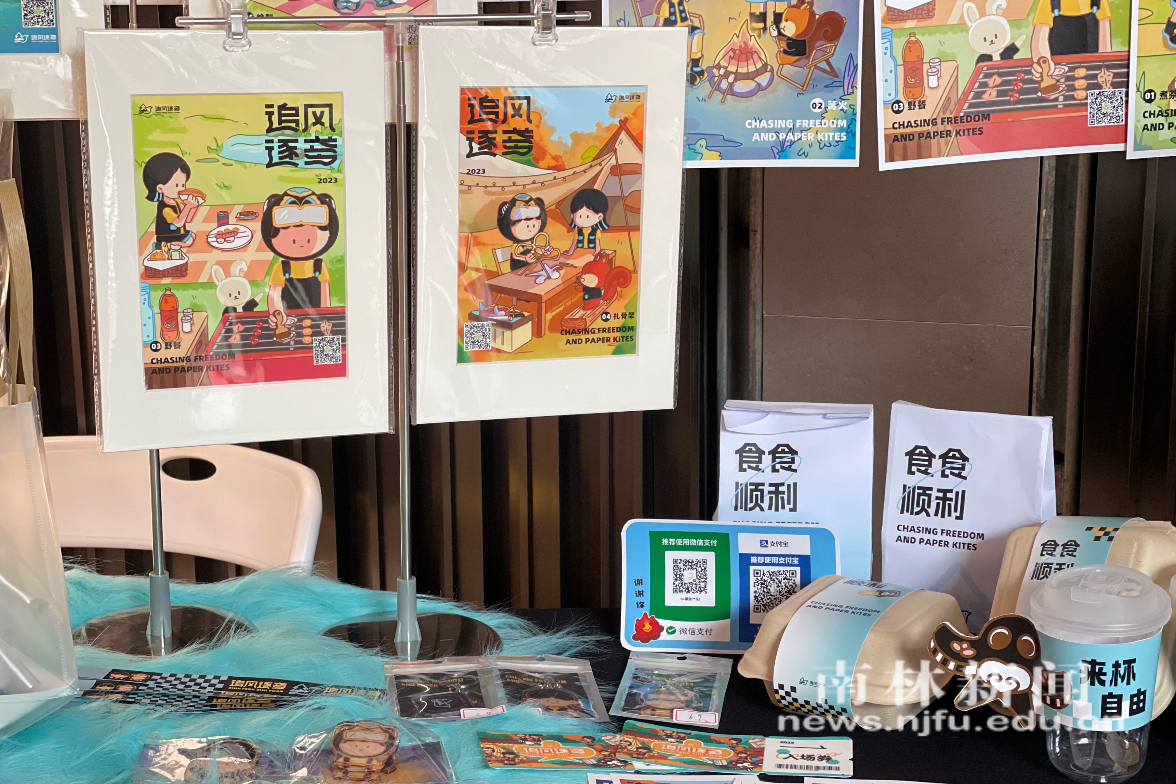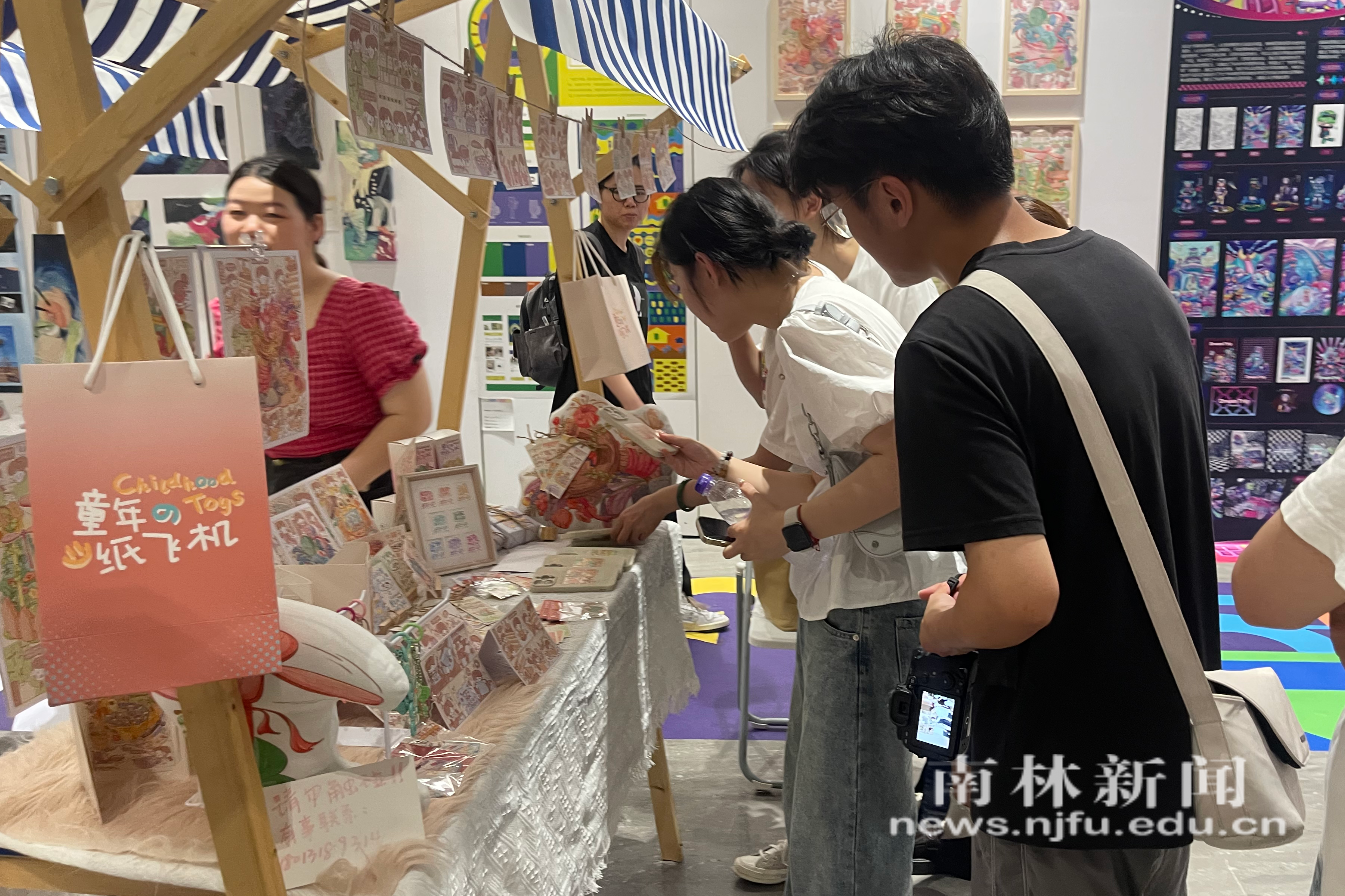 展览现场,有打造以亲子互动与陪伴为主题,满足居民多元化生活需求的“绿色童年-南京市玄武区樱骆花园社区绿地亲子情感交互空间设计”;有强调可持续发展理念,对展览空间进行规划和设计的“回归绿里——南京玄武区垃圾分类科普展览空间”;有呈现全球变暖临界状态下植物、动物和人类相互依存关系的“生生不息”。还有的作品融合传统拓印、编织、绘画以及现代AI、VR等技术进行创作:名为《窥》的装置作品,造型取自人体各种感官,使用中国传统漆艺工艺的脱胎手法,用组合造型的方法创作;名为《桃色满园》的MG动画短片,以探讨水蜜桃产业振兴为故事主体,通过简单明了的图形化手法绘制画面内容,并结合本地特色提出了创意体验农家乐产业的新理念。此外,书签、徽章、贴纸、抱枕……同学们的创意以各种形式在各自展点陈列,吸引众多观众驻足欣赏。