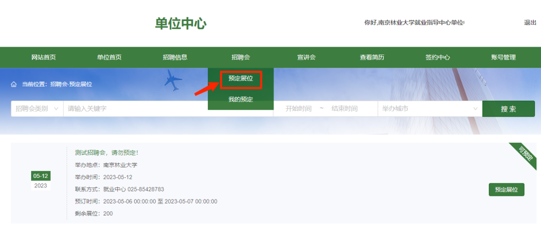 有意参会的用人单位请登陆南京林业大学就业信息(njfu.91job.org.cn),点击"单位登录"注册,根据网站提示填写单位详细信息、上传资质证明材料,在单位中心点击"招聘信息-发布招聘职位",发布成功后点击"招聘会-预定展位"选择春季就业集市系列活动场次。
