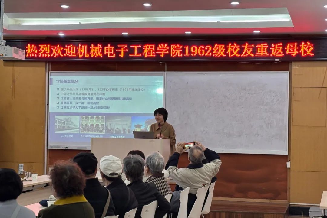 院党委副书记、副院长李婕代表学院对不辞辛苦、远道而来的耄耋之年老校友们表示热烈欢迎和诚挚感谢,并向校友详细介绍了学校的发展现状、办学规模、学科特色以及学院在学科建设、科学研究、人才培养等方面取得的成就。她指出母校是校友最鲜明的标签,每一名校友都是学院的牵挂,希望广大校友积极参与、支持学院事业发展,为机电学院高质量发展建言献策。校友张昭荣代表1962级林业机械系(机电学院前身)所有同学表达对学院、学校的深厚情谊。他在发言中深情感恩母校多年来的培养和教育,为母校的发展成就感到无比骄傲和自豪,期待更多优秀机电学子为祖国的林业机械事业贡献力量。校友们畅谈往昔纯洁、快乐、勤奋、艰苦的青春岁月,表达着对母校生活的深切怀念和以及对同窗好友的深深祝福。